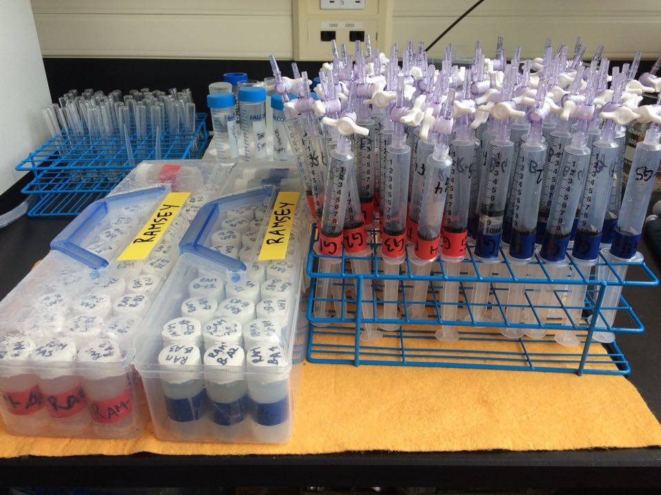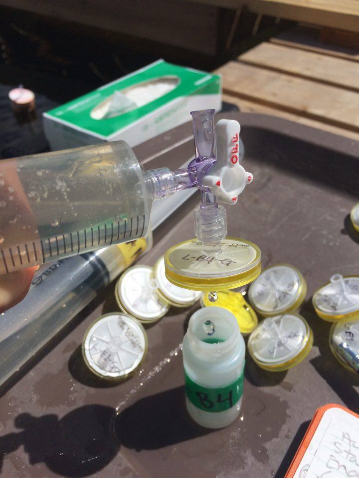 In the side of each mesocosm we attached a syringe and clear tubing (with a float on top for ID), which allowed us to take water samples from the sediment of each mesocosm. Using a variety of methods and specialist equipment, including a TOC analyser, gas chromatograph and spectrophotometer, we were able to obtain measures of dissolved organic carbon (DOC), methane, nitrogen and phosphorus from the water samples. We also took surface phytoplankton measures using a BenthoTorch (a chlorophyll fluorometer) and sampled the zooplankton with emergence traps. All of these measures were used to determine how tOM additions affect lake ecosystems.