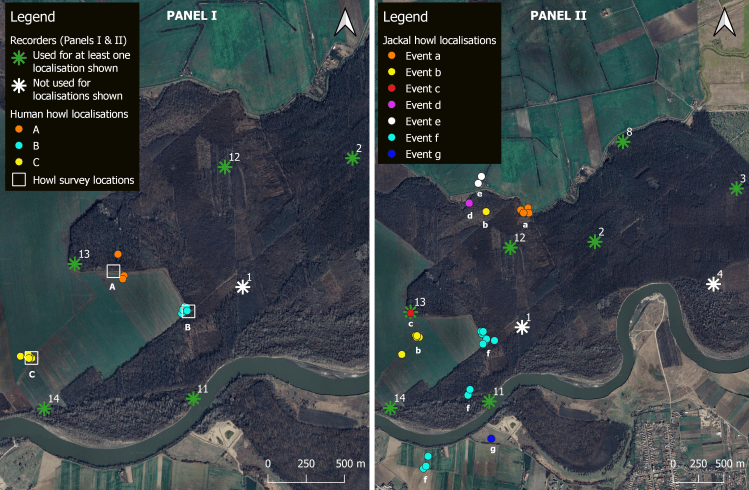 We recorded jackal howls every night of the survey and successfully localised 27 jackal and 16 human howls, with human howls localised to within an average of 41 m of their actual location. The average distance between the recorders and estimated positions of vocalising jackals was just under 1 km, with howls detected from as far as 2.5 km away. However, some jackal howls were not detected clearly, or at all, on active recorders that were as little as 0.9 km away.